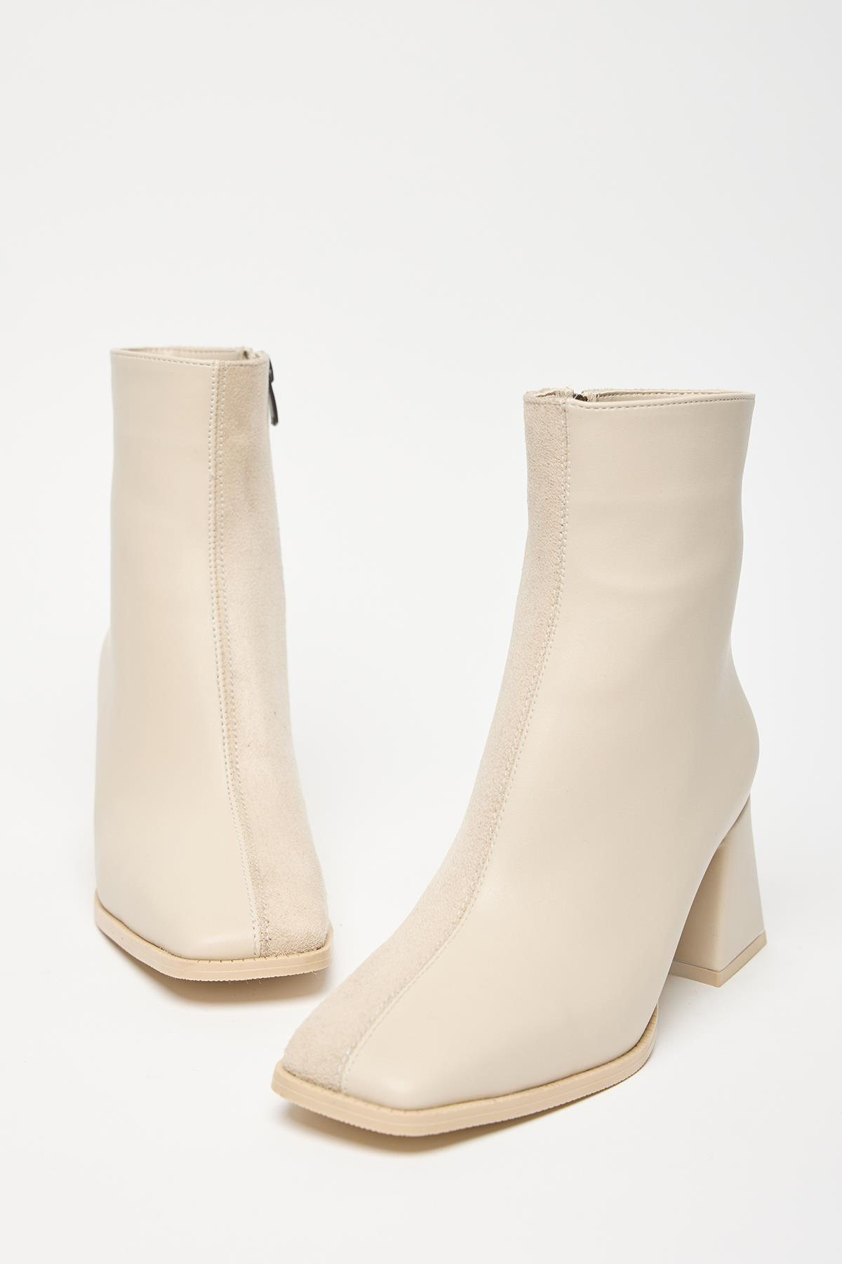 Kadın Bej Süet Bot & Bootie Küt Burun Topuklu Kontrast PU Deri Fermuarlı Şık