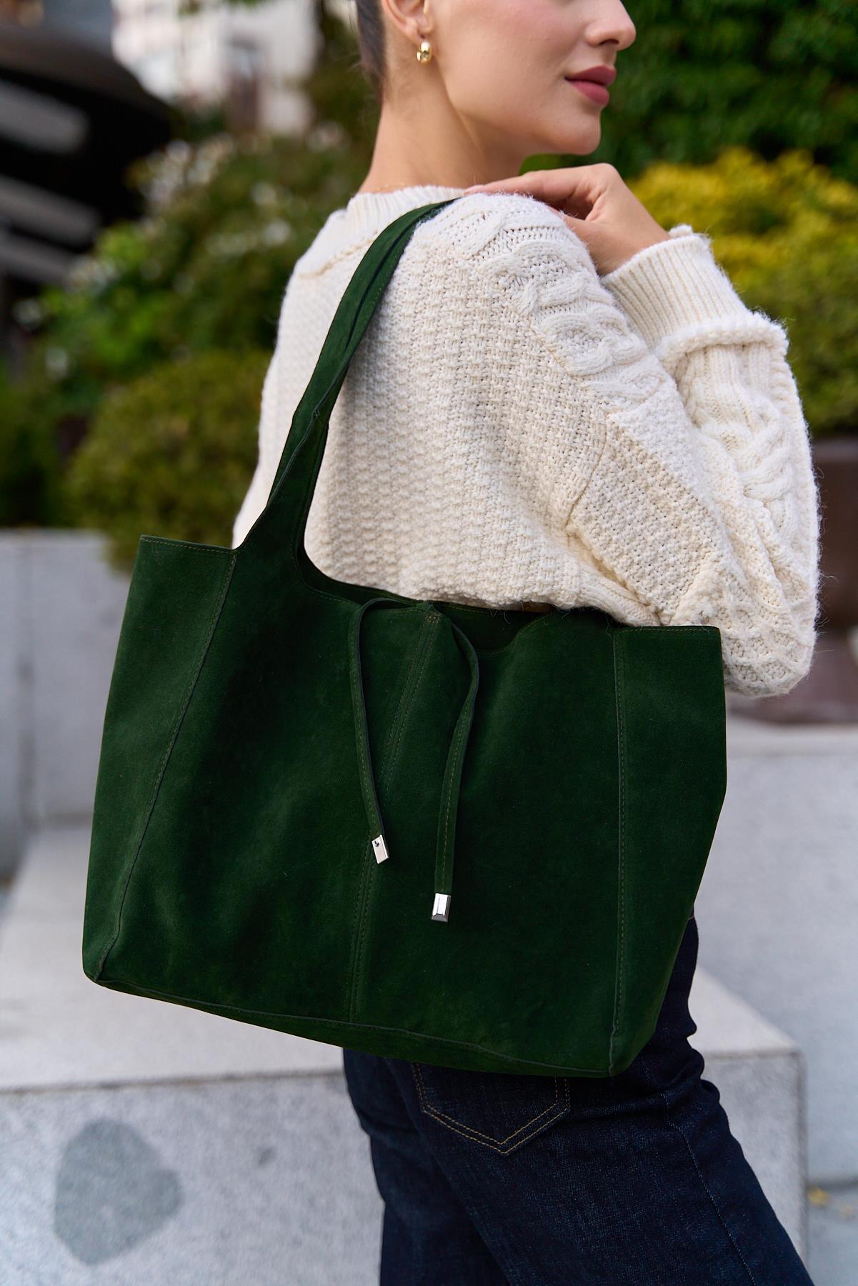 Yumuşak Süet Bağcık Detaylı El Ve Omuz Çantası Yeşil Süet